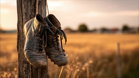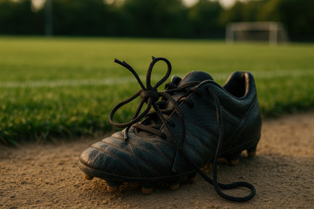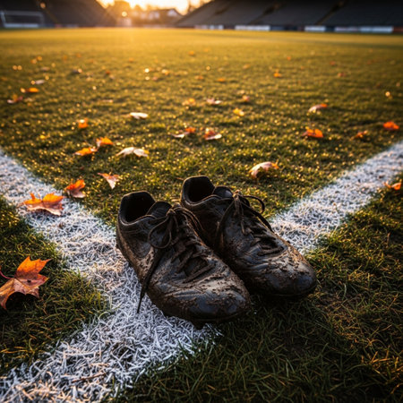 Dirty leather soccer boots resting beside a patchy goal line on a muddy pitch, captured in dramatic detail