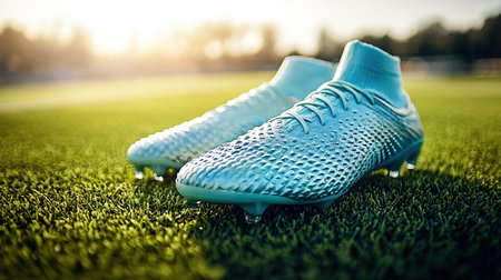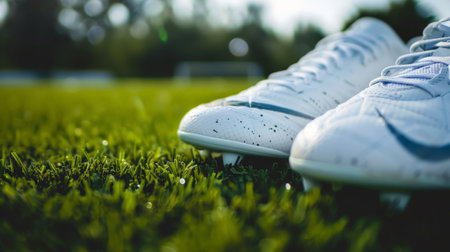 A close-up shot of a pair of modern soccer cleats resting on vibrant green turf, ready for the game under bright sunlight.