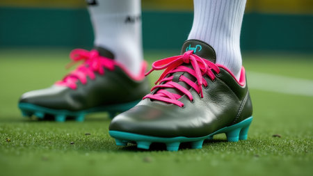 Close-up of colorful soccer cleats with pink laces on green turf.