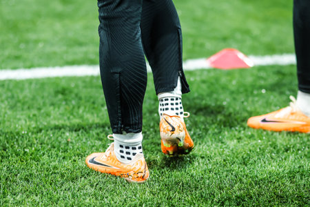 Soccer player wearing soccer shoes walking on grass with selective focus.