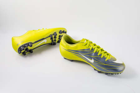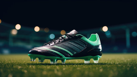 Professional soccer shoes cleans close-up on green grass with an outdoor stadium in the background. It's a great illustration for advertising or promotional materials.