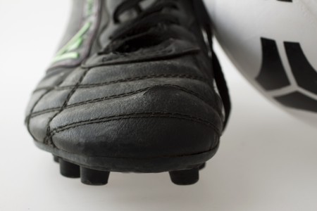 A set of football cleats left on the pitch after an intense match, with grass stains visible.