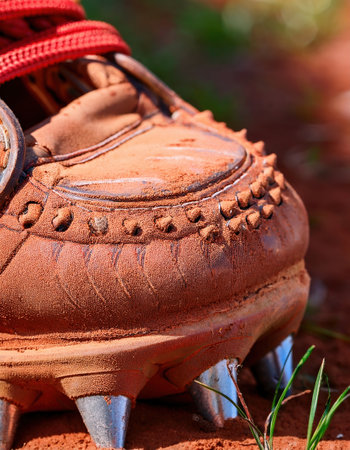 Close up of a worn athletic shoe with spikes, showing dirt from intense clay competition.
