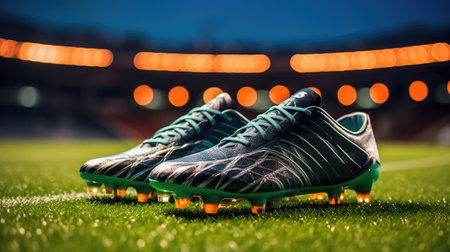Professional soccer shoes cleats close-up on green grass with an outdoor stadium in the background. It's a great illustration for advertising or promotional materials.
