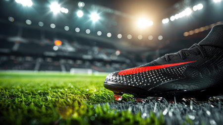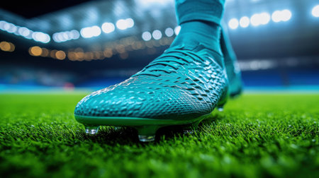 A vibrant football boot rests on green grass, ready for action under stadium lights.