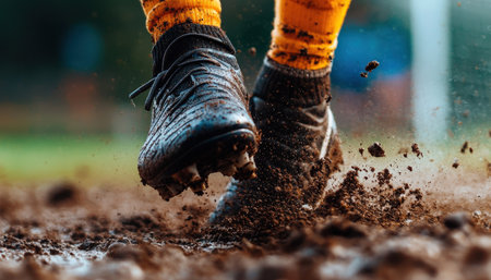A soccer player is kicking a ball in the mud. The muddy field and the player's muddy shoes create a sense of chaos and disarray