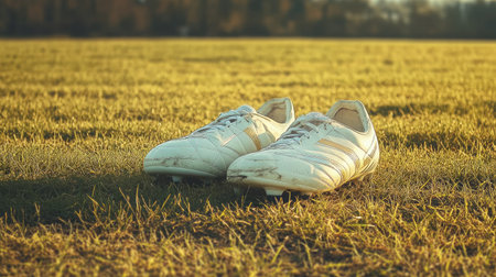 A pair of worn white soccer cleats rests on a grassy field, illuminated by soft evening light, perfect for showcasing athleticism and the beauty of outdoor sports.