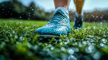 Bright soccer shoes splash water as a player runs on the sunlit green field.