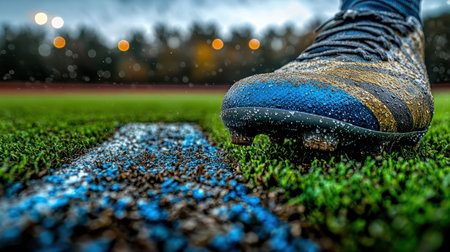 A soccer cleat stands on a muddy patch of grass, showing raindrops and vibrant colors.