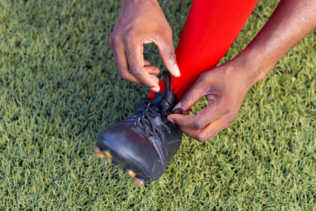 African American young male athlete tying shoelaces on a soccer field outdoors, copy space. He has short hair, wearing red socks and black cleats, unaltered.