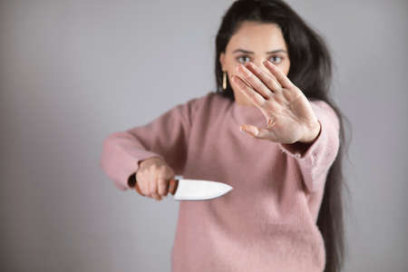 Murder and Halloween theme: A man's hand reaching for a knife, a human hand holding a knife isolated on a gray background from above