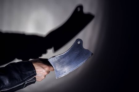 Hand with an ax on the background of a wall with a shadow from the ax. Copy space