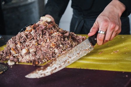 male chef hands cut boiled lamb meat with knife to cook traditional oriental Uzbek pilaf n Central Asian Pilaf Center Besh Qozon in Tashkent in Uzbekistan