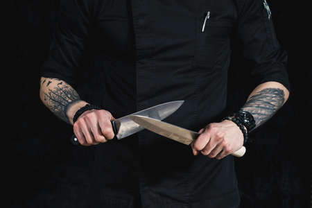 Young attractive man chef in black uniform hands in tattoos holds two knives. black background