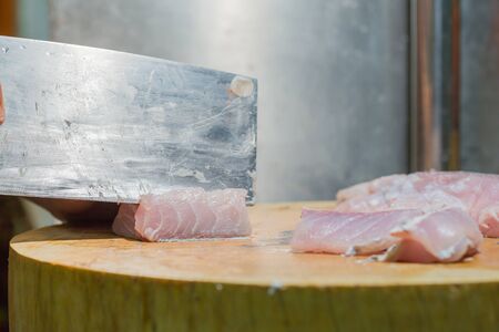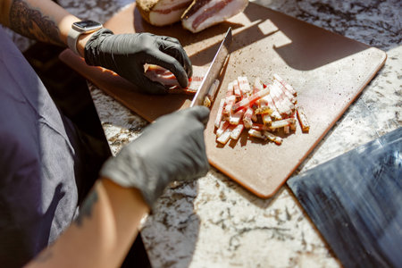 slicing raw meat, bacon, pork, cooking meat. Butchering pork, beef. Cutting fresh meat