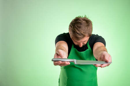 Supermarket employee with green apron and black t-shirt offer a knife isolated on green background