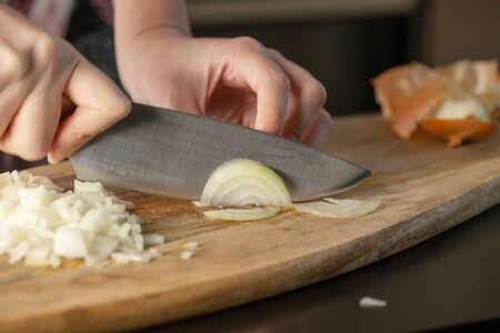 The cook cutting and dice onion on a wooden chopping board. Closeup.