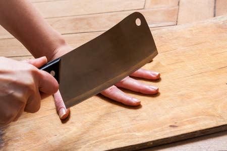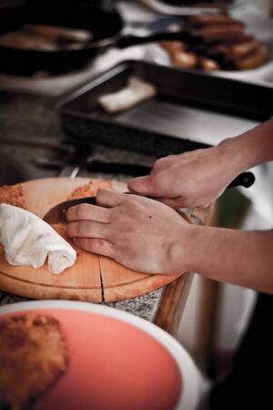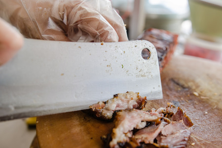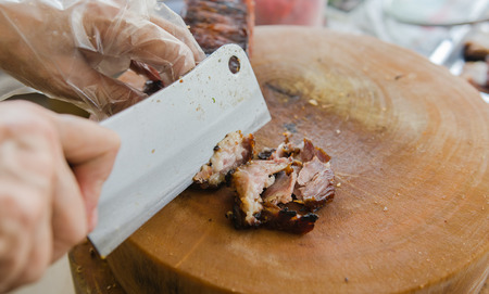 Hands of a male chops roast pork with a cleaver at a holiday party