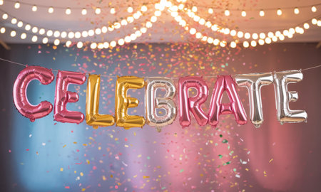 Foil balloons spelling CELEBRATE in pink, gold, and silver, surrounded by falling confetti and illuminated by warm string lights, creating a festive atmosphere.