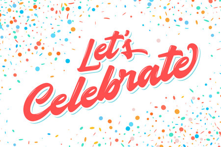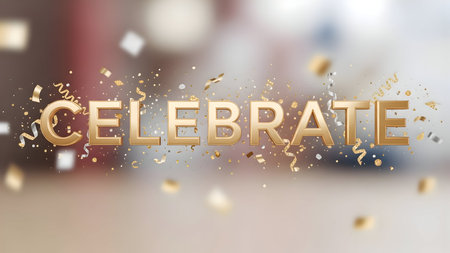 A beautiful golden 'celebrate' word with glittering confetti exploding on a soft bokeh background.