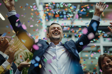 A businessman in a suit throws confetti in a vibrant environment, symbolizing financial achievement, career success, and business innovation.
