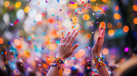 Hands Tossing Colorful Beads and Confetti at Mardi Gras Celebration. Concept of Festive Traditions, Joyful Moments, Party Atmosphere. Copy space.