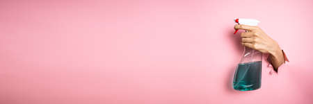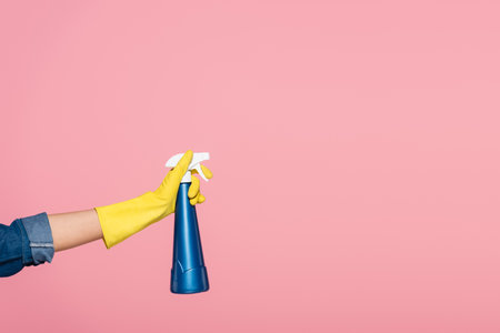 Close up of person's hand with cleaning sprayer isolated on yellow background. Space for text.