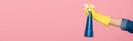Cropped view of woman in rubber glove holding detergent isolated on pink