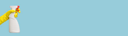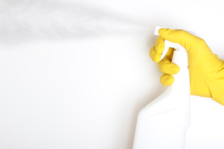 hand with rubber glove holding cleaning spray bottle on yellow backgrund. copy space available