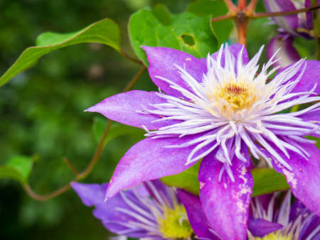 Purple Clematis flowers against the background of green leaves. Studio Photo