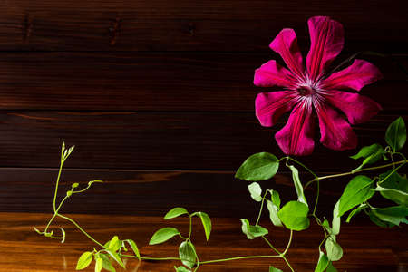 Beautiful red velvet-shaped clematis flowers against a wooden board background.