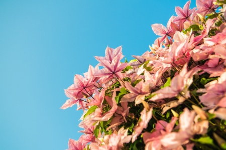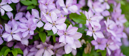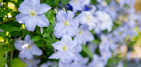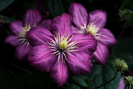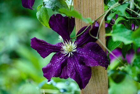 Flowering purple clematis in the garden. Flowers blossoming in summer. Beauty in nature.