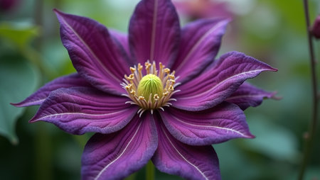 Vibrant purple clematis bloom with velvety petals and yellow center on soft green background