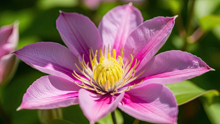Bright pink clematis flower, nature background. Garden climbing flowers with white stamens. Clematis on a green blurred background closeup. Flower for postcard, greeting card.