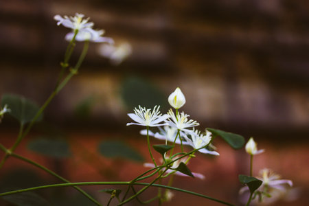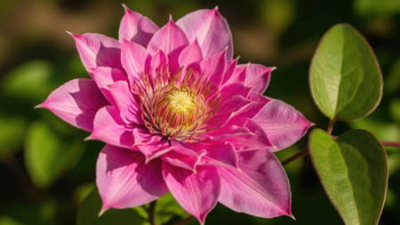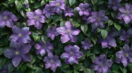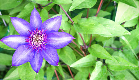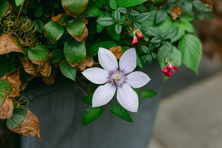 Beautiful clematis flower blooming among green leaves in urban garden setting during sunny day