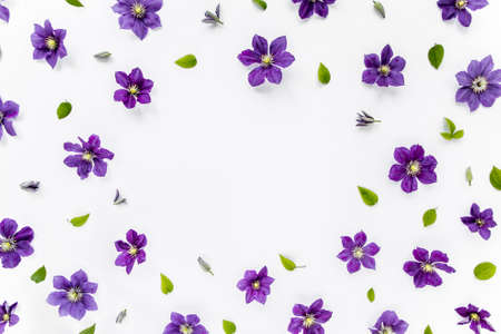 Frame of purple clematis flowers and leaves isolated on white. Top view. Copy space