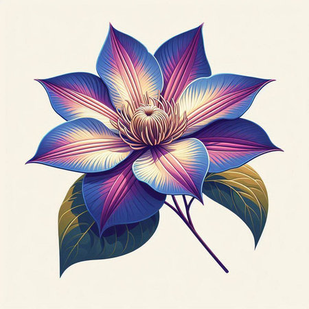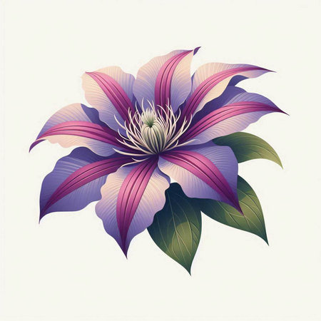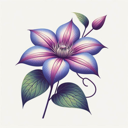 A vibrant pink clematis flower stands out against a soft white background. Its striking petals and delicate green leaves create a peaceful and elegant composition, highlighting nature's beauty.