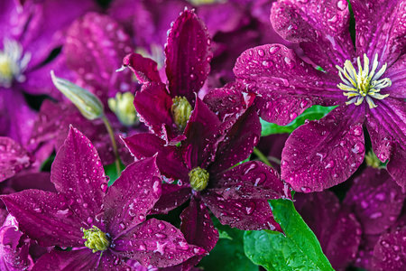 Purple clematis flowers (Clematis viticella) in water drops after rain