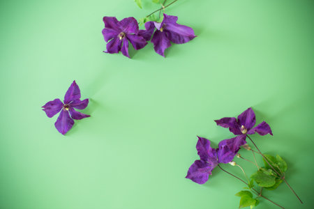 minimalistic flower arrangement. beautiful of climbing clematis flowers and leaf green on a white background. flat lay, vertical frame