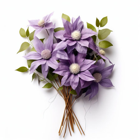 a stunning bouquet of vibrant clematis flowers, each adorned in a unique palette of colors, meticulously wrapped in paper for a thoughtful gift. isolated on a pristine white background, the bouquet exudes elegance and beauty. ai generated
