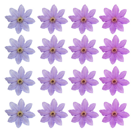 Flat lay composition of purple clematis flowers and leaves isolated on white. Top view. copy space