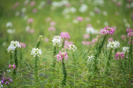 spider flower garden in spring garden with blur foliage bokeh background