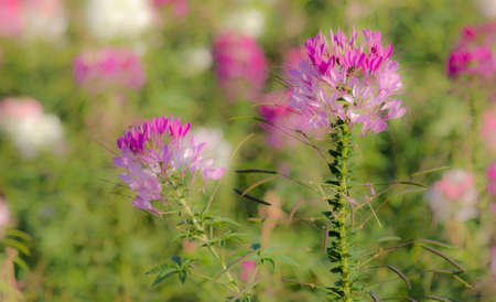 Purple and white Cleome Spinosa or Spider flower blooming field.