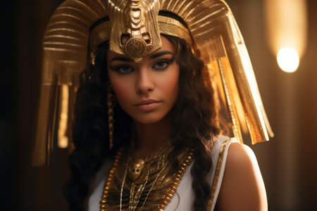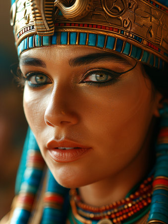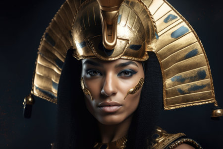 Egyptian queen wearing a golden headdress with intricate details and a regal expression on her face''