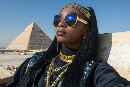 Stylish woman wearing sunglasses poses confidently near the Great Pyramid of Giza, blending modern fashion with cultural heritage in a stunning backdrop