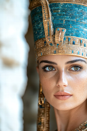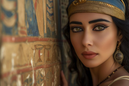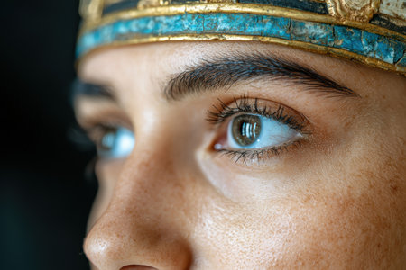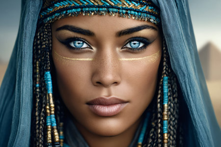 Beautiful Egyptian queen with blue eyes, traditional makeup, and headdress poses for a portrait