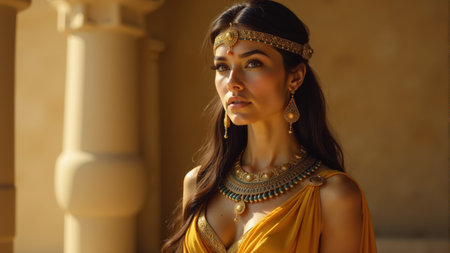 A stunning woman stands gracefully in a golden attire, adorned with intricate jewelry and a majestic headpiece, exuding royal charm in a sunlit historical setting, embodied timeless beauty.