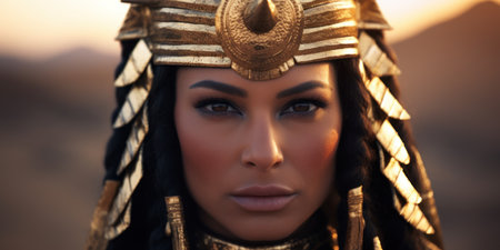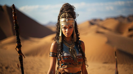 Portrait of a beautiful egyptian woman warrior in the middle of the desert.