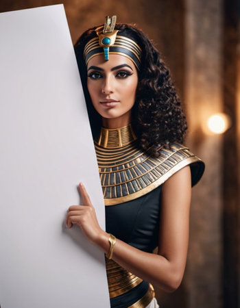 Elegant Egyptian woman adorned in traditional jewelry stands holding a blank poster in his hands. AI art. Striking Egyptian beauty in majestic palace environment. Copy space for text.
