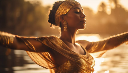 A modern-day Cleopatra, adorned in gold jewelry, standing on the banks of the Nile River